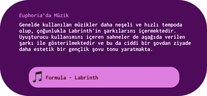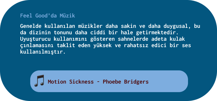 İki dizide de benzer şekilde uyuşturucu kullanma istegi müzik seçimleri ile verilmiştir, Euphoria’da bu “Formula” şarkısıyla verilirken, Feel Good’da tiz ve rahatsız edici bir ses ayni amaçla kullanılmıştır.